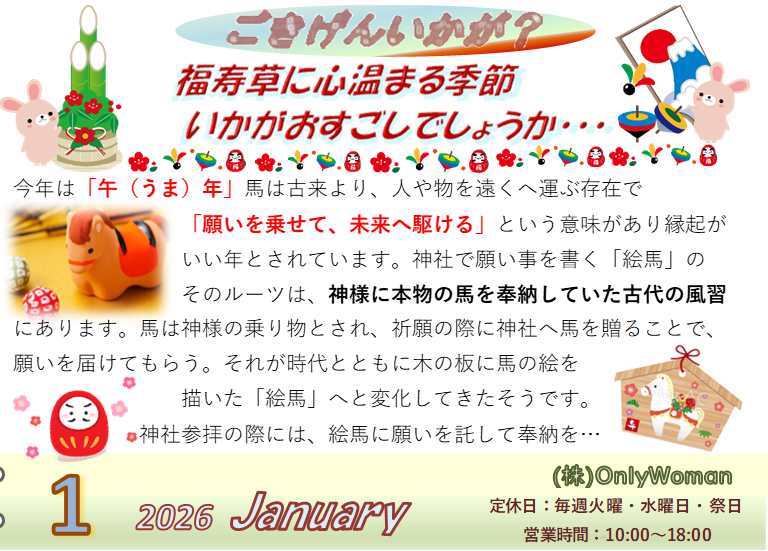 今年は「午(うま)年」馬は古来より、人や物を遠くへ運ぶ存在で「願いを乗せて、未来へ駆ける」という意味があり縁起がいい年とされています。